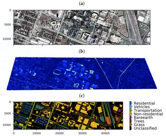 Spatial coverage of point cloud data (“LidarPointCloudTiles”) and the aerial images were slightly different, hence, in this research, overlapping regions of “LidarPointCloudTiles” and aerial images were used (see Figure 2). The point cloud has spatial resolution of ≈0.45 m resolution with ≈11 million points and a higher resolution of aerial images (0.05 m) with pixels of 12,020 × 47,680 (0.61 km × 2.2 km). In fact, the GT label contained 20 detailed urban LULC classes with a spatial resolution of 0.5 m. Corresponding labels for point cloud are extracted by overlaying “LidarPointCloudTiles” on geo-referenced GT label. Since the GT labels are originally provided for 2D-segmentation, derived point cloud-based labels were a few for some classes. Hence, this study further merged some classes together to make more reliable classes with enough number of point clouds as well as to reduce the imbalance in the dataset. Eight classes are created such as Unclassified, Grass, Trees, Bareearth, Non-residential building, Transportation network, Vehicles, and Residential building by merging some of the relevant classes. Figure 2 shows (a) RGB, (b) LiDAR point clouds and (c) corresponding label data used in the University of Houston campus, USA dataset. Hereafter, University of Houston campus, USA dataset will be refered as UHC dataset.