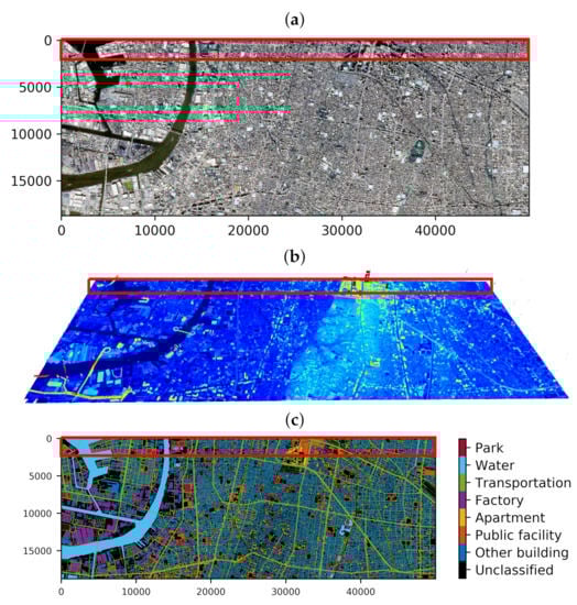 Osaka dataset, where (a) shows the aerial image, (b) shows the aerial point cloud and the color representing the elevation, and (c) shows the corresponding labels. The red box shows area used for testing and the remaining area used for training and validation.