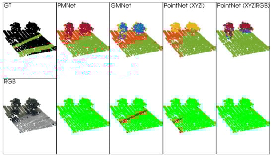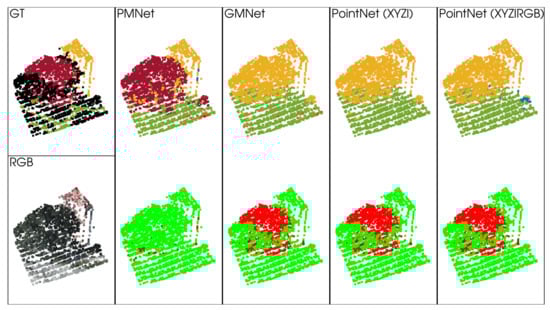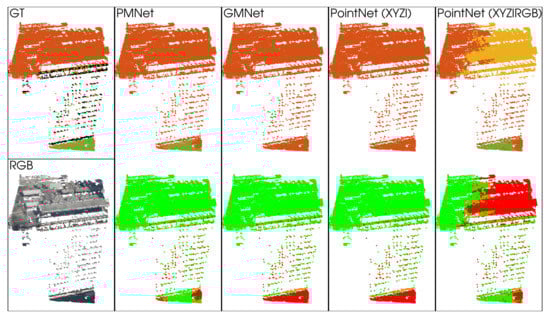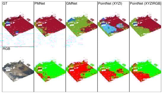 The proposed PMNet has compared with three other point cloud 3D segmentation deep learning networks. PointNet (XYZI); which uses only point cloud, no RGB bands from aerial images are used. PointNet (XYZIRGB); used both point cloud and aerial image RGB bands and trained as 3D data. Each coordinate of LiDAR point clouds are concatenated with the spectral information and class label extracted from aerial images as well as the intensity, and hence, each point represents by XYZIRGB values. Therefore, PointNet (XYZIRGB) is considered as an observational-level fusion and vector stacking approach ([,,]). GMNet, a deep feature-based fusion approach that fuses features from the point cloud and global features from aerial images. Hence GMNet is considered as a feature-level global fusion approach, these kind of approaches are generally used in multimodality fusion networks for 2D-segmentation [,,,]. The following section qualitatively and quantitatively evaluate the performance of 3D segmentation for each model.