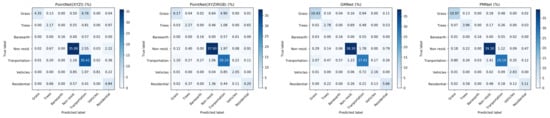 Several previous studies [,] have indicated importance of carrying out the detailed per-point wise consistency analysis. Hence, this study utilizes the confusion matrix and metrics derived from it to asses the constancy of class in the resulted 3D segmentation and GT labels. This section investigates the 3D segmentation results in detail by computing percentage-based confusion matrix with GT label data. Figure 8 and Figure 9 show the percentage-based confusion matrix for UHC dataset and Osaka dataset respectively. Sum of the values in diagonal axis in the confusion matrix shows the percentage of points consistent in both predicted and GT label data. This percentage-based analysis provides a detailed idea about the percentage of points correctly classified (consistent)and miss-classified (non-consistent). In case of UHC dataset around 93% percentage of the points consistent in case of PMNet, while in case of GMNet, PointNet(XYZIRGB), and PointNet(XYZI) show 87%, 82%, and 78% respectively (Figure 8). In case of Osaka dataset around 81% percentage of the points are consistent in case of PMNet, while in case of GMNet, PointNet(XYZIRGB), and PointNet(XYZI) show 76%, 79%, and 77% respectively (Figure 9). PMNet not only shows the higher percentage of consistency but also shows significant improvement in classes which have less percentage of points available compared to the whole data. In order to get an overview of total amount of the data we have attached non-normalized confusion matrix in Appendix A ( Figure A6 and Figure A7) for UHC dataset and Osaka dataset respectively.