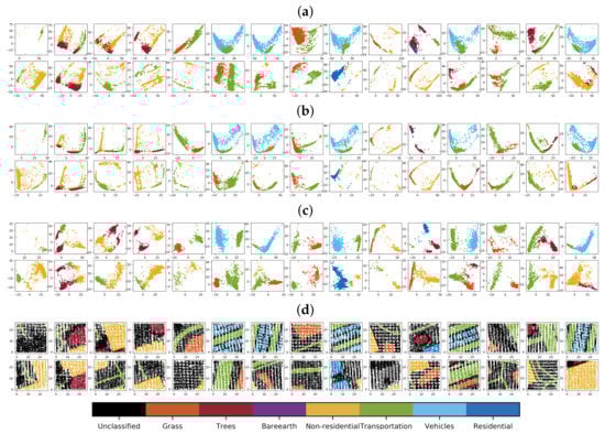 PCA scatter plot with the first component as x-axis, second component as y-axis and GT label used as the base map. PCA scatter plots are used to evaluate the potentiality of 256 features to check the ability to differentiate the clusters of the classes. Figure 10 and Figure 11 show the clusters of several classes and it can be visually evaluated whether these class-based clusters formed in a particular location and separable easily. If the class-based clusters are sparsely distributed and show mixed class representation in PCA plots, it indicates the inefficiency fusion strategy of a particular model. Figure 10 shows the PCA plots of PointNet (XYZIRGB), GMNet and PMNet fusion feature layers for UHC dataset. Random patches are selected to generate the PCA plot from the test dataset. PMNet fusion feature layers form more differentiable clusters compared to PointNet (XYZIRGB) and GMNet. GMNet fusion feature layers show good distribution but class clusters not as differentiable as in the case PMNet, however, GMNet shows better fusion efficacy than PointNet (XYZIRGB). PMNet shows better clustering in cases of almost all the classes as shown in Figure 10, while GMNet struggles in forming clusters in between Non-residential and Tree classes. GMNet and PointNet (XYZIRGB) are not so efficient in separating the Vehicles and Transportation classes. In general, the PCA plot evidenced that the point-wise fusion strategy of PMNet is more effective than observational-level (PointNet (XYZIRGB)) or global feature-level fusion (GMNet) strategies.