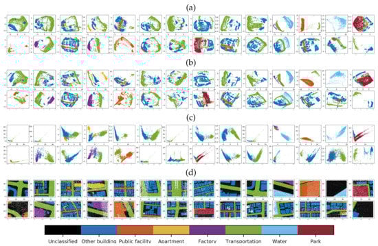 In case of the Osaka dataset, PointNet(XYZIRGB) shows an improvement compared to PointNet(XYZI) in terms of both average class accuracy (0.65) and overall accuracy (0.79), and hence, it is evidenced that the even simple observation-level fusion improves the performance than using only XYZI data (Table 2). Osaka study area is a relatively complex urban area with densely covered buildings. Hence, it is a challenging task to accurately classify more or less similar visual representation classes such as Other buildings, Public facility, Apartment, and Factory. In general, results show that PMNet outperforms all the other models in terms of Avg.CA (0.68) and OA (0.81). PMNet performs better in class-based accuracy for all the classes other than Public facility and Apartment class. However, Table 2 clearly indicates that the usage of RGB information significantly improves performance. Some classes like Apartment and Public facility show very low accuracy in the case of all the models mostly due to the very low percentage of samples, this issue has discussed in detail in Section 5.3.