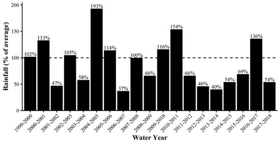 - Santa Barbara County Public Works Department. County-Wide Percent-of-Normal Water-Year Rainfall. Available online: https://www.countyofsb.org/uploadedFiles/pwd/Content/Water/Hydrology/Rainfall%20-%20Annual%20Percent%20of%20Normal%20-%20CountyWide.pdf (accessed on 13 November 2019).