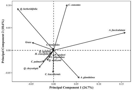 Principal components analysis (PCA) loading plot of species cover data from the field survey transects. The analysis includes species that were dominant (>25% cover) in at least one transect. The vector for Quercus agrifolia is very short and not intelligible.