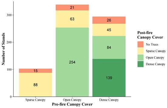 The conifer stand boundaries were overlaid onto high-resolution imagery available through the National Agriculture Imagery Program and Google Earth (Google, Mountain View, CA, USA). We utilized images captured from 2002 to 2018. Percent canopy cover from before and after the fire was manually assessed and recorded for each stand. Canopy cover was classified into four classes: no trees (0% canopy cover), sparse (1–25% canopy cover), open (25–75% canopy cover), and dense (75–100% canopy cover). Thresholds in 25% increments were selected to minimize subjectivity and error during the manual interpretation process []. They are similar to thresholds used by Canada’s National Forest Inventory [] and previous studies [].