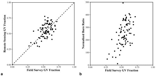 Comparison of (a) 2018 green vegetation (GV) fractions and (b) 2018 normalized burn ratio (NBR) values with estimates of GV cover from the transect photographs.