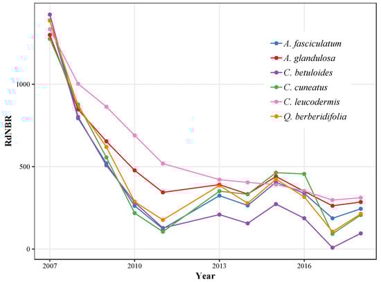Mean relative delta normalized burn ratio (RdNBR) trajectories for six chaparral species. RdNBR trajectories were extracted from the locations of the field survey transects. The transects were grouped by dominant species, and the mean trajectory was calculated for each species.