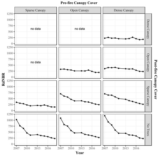 Mean RdNBR trajectories for conifer stands with different combinations of pre-fire and post-fire canopy cover.