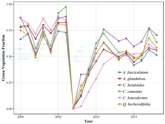 Mean GV trajectories for six chaparral species. GV trajectories were extracted from the locations of the field survey transects. The transects were grouped by dominant species, and the mean trajectory was calculated for each species.
