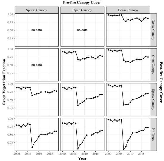 In the conifer stands, GV fractions declined between 2006 and 2007 as a result of the fire and increased between 2007 and 2018 as vegetation regrew (Figure 9). Conifer stands that experienced partial canopy loss exhibited linear recovery trajectories, while stands that experienced complete canopy loss exhibited logarithmic recovery trajectories. In stands that had small amounts of canopy cover after the fire, the post-fire GV signal must have been strongly influenced by shrubs and herbaceous species in the understory.