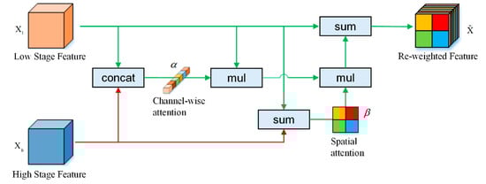 (1) Channel Attention: Each filter performs pattern detection, and each channel of the feature map is a response activation of the corresponding convolutional filter []. In a standard CNN, the importance of each channel is considered to be the same. Thus, applying attention mechanisms to feature channels intuitively distinguishes the features in different stages, and a channel attention map is produced to enhance feature consistency. For channel-wise attention, we first upsample the high stage features using bilinear interpolation to make them have the same shape (except in channel dimension) as the low stage features . Then the two sequences of features are concatenated to generate channel-wise statistics. The global information are computed using global average pooling for the concatenated features. The generated vector , which can be interpreted as a set of the channel descriptors for the image, is calculated by