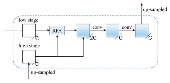A decoding stage embedded with proposed attention module, where ‘RFA’ refers to the attention module, and ‘C’ refers to channel number of features.