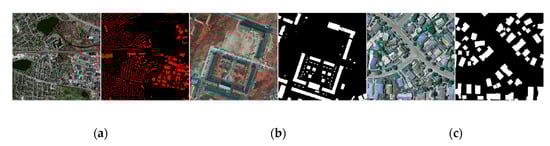 WHU Aerial Dataset (WHU) []: This dataset contains 8189 RGB tiles with 0.3 m ground resolution, including 187,000 samples of building in New Zealand. These 512 × 512 images are divided into three parts by the provider: 4736 tiles for training, 1036 tiles for validation, and 2416 tiles for test. Each tile has a corresponding Boolean raster map derived from the building vector map. Figure 4 shows some images and reference data from three datasets.