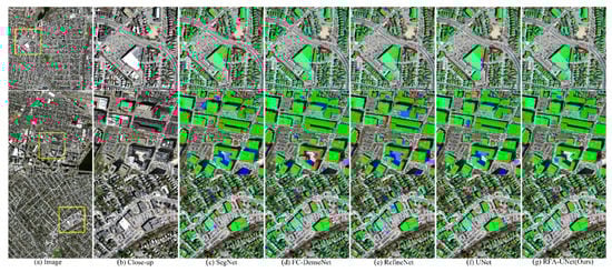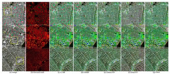(1) Mass. Buildings: As shown in Figure 5, CAB (Figure 5c) and Ours-RFA (Figure 5g) achieved better global performance than other attention methods visually. There are many FPs and FNs in the results of both GRID (Figure 5d) and DenseAN (Figure 5e). DualAN (Figure 5f) had difficulty in recognizing the small and dense buildings. Figure 6 shows the close-ups (as marked in yellow rectangles in Figure 5a) of the results for detailed inspection. The results in Figure 6 demonstrating that most buildings were correctly identified using all five methods, but CAB, GRID, and DenseAN tended to misclassify pixels as some FPs are found in the areas covered by ground or shadows (Figure 6c–e). DualAN (Figure 6f) performed better in the large building pixels. However, the FPs and FNs in the dense residential areas indicate that DualAN does not perform well enough.