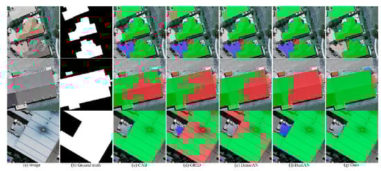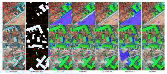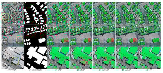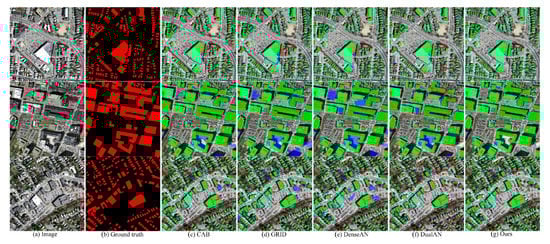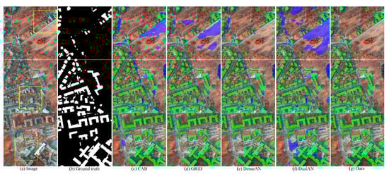 (2) Potsdam: Figure 7 displays the classification results on Potsdam test sets. Ours-RFA (Figure 7g) outperforms the other four methods because there are many FPs generated in the prediction (Figure 7c–f). The result of DenseAN is slightly better, except that some FPs in the first two rows of Figure 7e. The FPs in the results of CAB, GRID, and DualAN (Figure 8c,d,f) indicate that these models are sensitive to the low vegetation and roads, and they frequently misclassify vegetation pixels similar to the color of the rooftops as building pixels. Though the result of DualAN in the last row (Figure 8f) has more TPs, it also tends to have more FPs. Compared the other attention methods, except DualAN, Ours-RFA (Figure 8g) achieves better performance which has more TPs and less FPs.