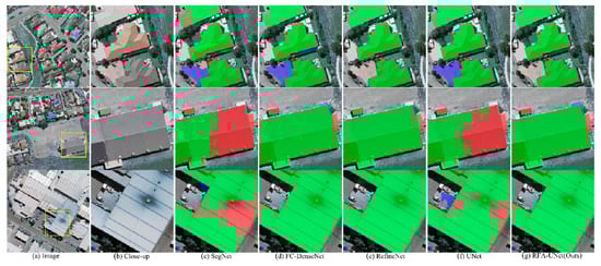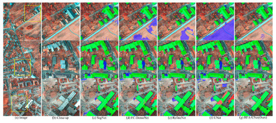 Figure 11, Figure 12 and Figure 13 demonstrate the close-up views of the five classification results using three subset images of three test sets, respectively. SegNet obtained comparable results on Potsdam (Figure 12c) but cannot distinguish large building objects on WHU, and obvious FNs appeared in the last two rows of Figure 13c, indicating that SegNet is not robust to identify complex manmade objects. The results of FC-DenseNet and RefineNet are relatively smooth, while they are still less accurate. As shown in Figure 11d and Figure 12e, FC-DenseNet and RefineNet did not perform well, as many FPs and FNs appeared in the second row of their results. Similar to the results on Mass. Buildings, there were also some FPs in the results of FC-DenseNet and RefineNet (see the first row in Figure 12d,e) on Potsdam. These findings suggest that their strategies for simply reusing features densely or using long-range residual connections are not efficient enough due to the categorical ambiguity of the low level features. Our RFA-UNet model were more effective in the recognition of building objects on three test sets. Though the result of RFA-UNet have a few flaws, they still perform more precise localization and accurate labeling (see Figure 11g, Figure 12g, and Figure 13g). Meanwhile, the performance of our model also shows that the RFA module has improved the classification ability of network, as compared to the performance of the UNet method.