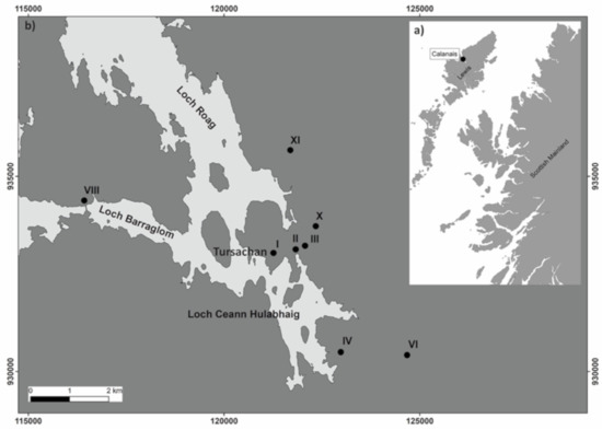 (a) Location map of Calanais, Isle of Lewis, Scotland; (b) location of the main Calanais sites including the Tursachan (Site I) and Site XI, the site of geophysical investigation.