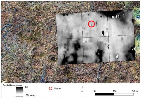 Geophysical remote sensing surveys, and in particular earth resistance survey, have been conducted at a number of Hebridean stone sites and proved successful for the identification of both buried stones and stone sockets where present. Earth resistance survey was undertaken by Patrick Ashmore as part of the 1979–1988 investigations of the main Calanais site [9]. These surveys used a twin probe resistance arrangement with 0.5 and 1.0 m spacings on 20 m grids. While the results showed a number of important buried features, the probe spacing and line spacing likely caused a spatial aliasing to some of the results. Despite this, anomalies were associated with the standing stones and pits within which they were sunk. Areas near exposed bedrock were generally indicated by higher resistivity, with areas of deeper burial by the peat showing generally lower resistivity. Lower resistivity was also associated with the impact of compaction from informal paths around the site. Magnetic susceptibility survey was also conducted by Ashmore at some local sites, for example at the Na Dromannan stone circle (Calanais Site X). However, results did not indicate any anomalies that might be associated with buried stone, burnt stone, or concentrations of charcoal. Earth resistance surveys were also conducted around the Clach an Trushal stone, western Lewis, where subsequent investigation showed a number of discrete anomalies associated with broken monoliths, packing stones, and pits [7].