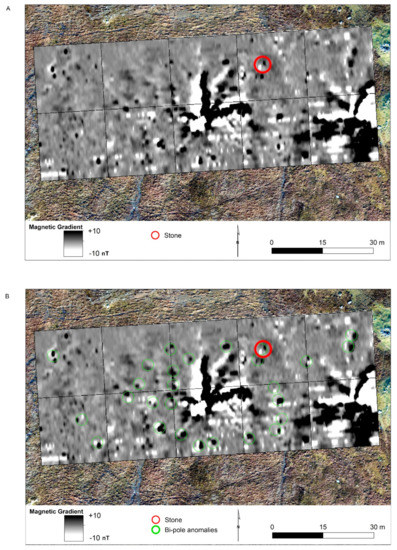 (a)Bartington Grad 601 magnetic gradient results acquired on 0.125x1.0m grid; (b) Magnetic gradient with bi-pole anomalies highlighted.