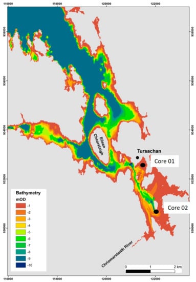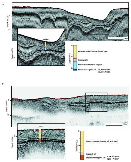 Two cores were acquired at specific locations in order to ground truth the seismic data and for the recovery of material for palaeo-environmental analysis and dating (Figure 8a,b). Core 01 showed a lithology consisting of organic silts at the base of the core (–8.15 to –8.25 m) overlain by a series of interbedded grey clay-silts (–7.40 to –8.15 m). The lowest interval (–8.10 to –8.22 m) contained organic silt, rich in distinctive plant debris: Cladocera (water-flea) valves and in the lowest part, charophyte oogonia. The data suggest a shallow weedy freshwater loch as the initial phase. The interval –7.60 m down to –8.07 m is represented by a curious deposit, leaving virtually no residue. The clay is light grey to white in colour and devoid of fauna apart from some small plant stems or possibly rootlets with a few small charophyte oogonia. This may represent a shallow freshwater body subject to drying out. The sample at –6.50 to –6.52 m contains rare Elphidum williamsoni, indicative of brackish water conditions. At -–7.80/–7.82 m, there are a few brackish foraminifera possibly indicative of a storm event or overtopping of what might have been a low coastal barrier prior to full marine access.