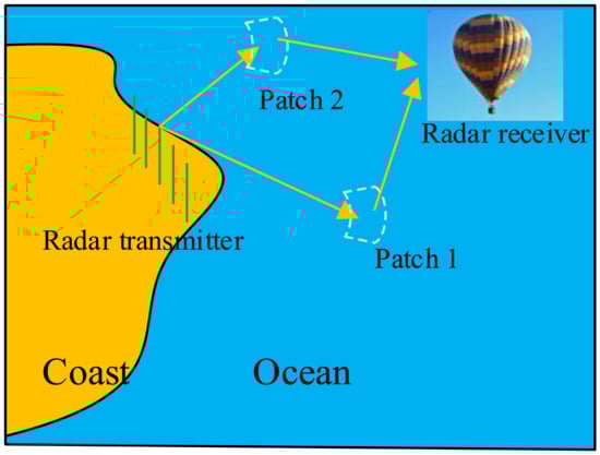 Air-borne radars have the ability to detect large areas of the sea, which is meaningful to extend coverage for ocean radars [,,]. To extend the scope of HF radio oceanography and meet the demands for large-area ocean observation, a new bistatic radar model so-called shore-to-air bistatic HF radar is designed for ocean observation []. The configuration is shown in Figure 1: The transmitter installed on the coast emits vertically polarized and narrow-beam electromagnetic waves to illuminate the ocean patch in a grazing incidence; the electromagnetic waves are scattered to a radar receiver deployed at an air platform (airplane or airship) owing to the rough sea surface; then the power spectra are estimated from radar echoes to extract the sea state information.