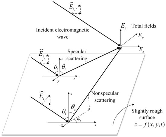 Substituting Formulas (11)–(13) into Rice boundary conditions [] and separating the first-order and the second-order terms in these formulas, and can be solved. Then the electric components of the reflected electromagnetic waves can be obtained. According to the relationship between the electric field and the magnetic field of Maxwell’s equation , where ∇ denotes the Hamilton operator, and is the permeability to the volume material, the magnetic components of the reflected electromagnetic field can be obtained.