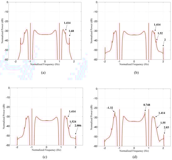 Figure 5 shows four simulated Doppler spectra for different scattering angles and azimuth angles. The radar operating frequency and wind speed are set to 18 MHz and 12 m/s, respectively. The wind direction is , which is referenced to the direction of the Bragg wave. The first-order Bragg peaks, which have the maxima amplitude, can be seen from the figure at the normalized Bragg frequency . Figure 5a shows the Doppler spectrum when the scattering angle and azimuth angle are , which is in a monostatic case. Figure 5b shows the Doppler spectrum when the scattering angle and azimuth angle are , respectively, which is in the land-based bistatic case. The singularities at result from the second-order electromagnetic coupling and the hydrodynamic coupling discussed in []. Other singularities at the normalized frequency of for monostatic HF radar and at for land-based bistatic radar, resulting from “corner reflection” condition of second-order electromagnetic scattering [,]. Figure 5c,d show the Doppler spectrum in the shore-to-air bistatic radar configuration. Except for the singularities at the normalized frequency of , there are other singularities resulting from “corner reflection” in the Doppler spectrum. They will be discussed in next section. In addition, the Doppler spectrum is asymmetric about the zero frequency when the wind direction is perpendicular to the direction of reference. This asymmetry is caused by second-order electromagnetic scattering, which is different from monostatic and land-based bistatic cases.