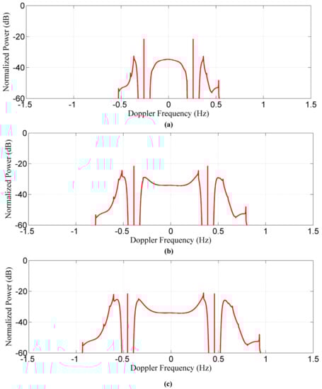 Simulated Doppler spectra at different operating frequencies. The operating frequencies are (a) 8 MHz, (b) 18 MHz, and (c) 25 MHz.