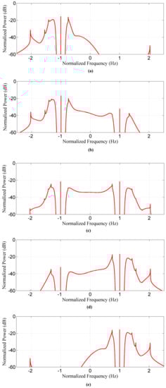 Simulated Doppler spectra with different wind directions. The wind direction is (a) , (b) , (c) , (d) , and (e) .