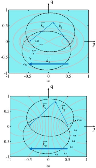 The singularities results from “corner reflection” [], except for the singularity at in Figure 5c,d. Taking Figure 5d for example, where the scattering angle and the azimuth angle are and respectively, additional singularities appear in the simulated Doppler spectrum. The normalized constant Doppler frequency contours are determined by formula (29) and the delta function in (31). Each point on the constant Doppler frequency contour gives a pair of and , as shown in Figure 9. The p axis is parallel to the direction of the Bragg wave, and the contours of constant normalized frequency for and satisfy the formulas (29) and (31). The case of “corner reflection” is presented by the black dashed curve, where and satisfy the relation