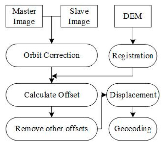 The flowchart of the offset-tracking technique using SAR data.