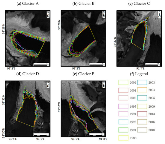The Landsat series data were easily affected by the cloud cover, and only 15 high-quality images were selected. The internal between two adjacent images was kept within one to three years. Due to the trouble of the Landsat 7 sensor since May 2003, two images (the day of 2003 and 2004) during the study period had strip-like data gaps. However, there is little influence in our study. The five glacial centerline information and area values were calculated based on visual interpretation. Figure 3 shows information of five glacier tongue outlines from 1988 to 2018. The base images are five glacier tongues from optical remote sensing of 1988, and the 15 different colored outlines represent information of the glacier tongue in different years over the past three decades. We can easily see the change during the past three decades. We can clearly see that the area and shape of the five glacier tongues change over the years. After accessing the glacier centerline and area the information, we repeated the work four times at different times and calculated the standard deviation. The results show that the standard deviation of the length of the glacier centerline does not exceed 26.2 m, and the standard deviation of the glacier area does not exceed 1000 m2. It proves that the results in this paper are reliable.