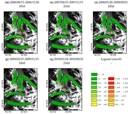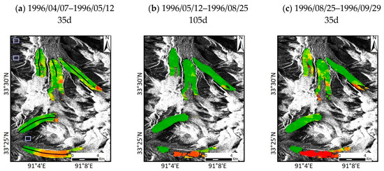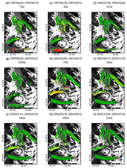 Due to the limitation of the SAR data, 10 ers-2 SAR images and 18 ENVISAT ASAR images, having the same orbit number and sensor, were selected in this experiment, and the offset-tracking technique was used to access the glacial flow velocities from 1996 to 2010. Figure 4 shows the glacial flow velocity maps. In Figure 4, the base image is studying the area’s SAR images, which has undergone a multi-looking process, and the colored raster data represents velocities in different periods. Due to larger intervals in some master images and slave images, a few areas have poor coherence and have no result of velocity. Fortunately, the vast majority of the results are good. We can directly observe the velocity change. The internal of master and slave images in this paper are kept within months as far as possible because the shorter periods can access a more accurate flow velocity. According to the regulation of the glacial flow velocity in Figure 4, we can summarize that the upper-glacier accelerated at first, and then, the state of accelerated motion slowly turns the glacial tongue in active periods. As to the accuracy assessment of the glacial flow velocity, several areas of non-ice region (The blue area in Figure 4a) were selected to calculate the displacement velocity. The average flow velocity of the non-ice area is 9.8 mm/d, which is far less than ice flow velocity. This can prove that the flow velocities in this manuscript are reliable.