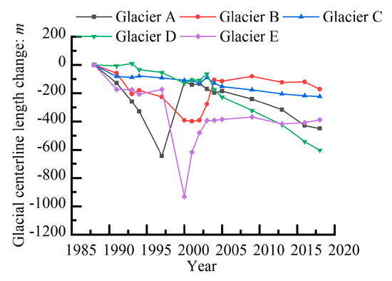 According to the length of the evolution of the glacial centerline (Figure 5), the five glaciers’ centerline evolution all show a retreating trend from 1988 to 2018. However, each glacier has its own change characters. Glacier A, B, and E have fierce fluctuation periods, and Glacier C and D have a stable evolution over the past 30 years.