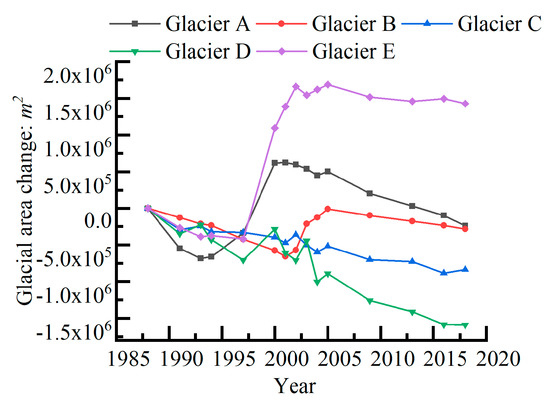 According to the evolution of the glacial area over the years (Figure 6), it is clear that nearly all of the statistics of the area show a retreating trend over the past 30 years. The only difference is Glacier A, B, and E, which have extraordinary experiences.