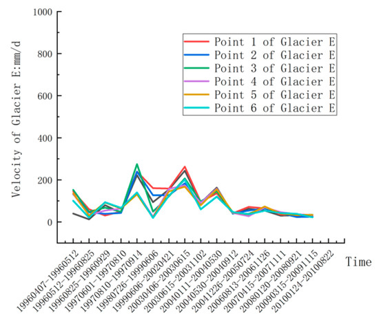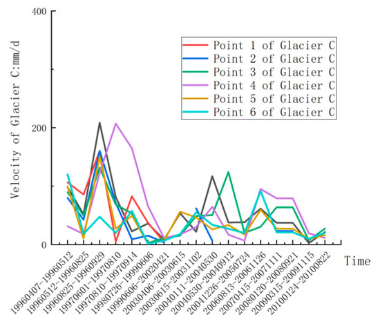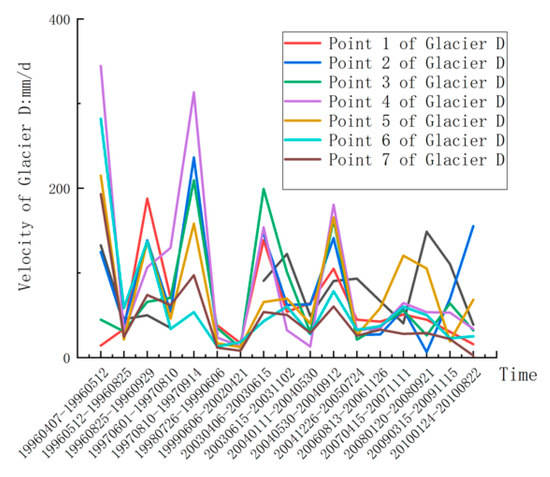 With the flow velocity information accessed above, we obtained the eight centerline point velocities of Glacier C and Glacier D from 1996 to 2010 (Figure 7 and Figure 8). From Figure 7, eight points’ velocities show similar rules. Namely, the velocities on Glacier C’s centerline keep stable from 1966 to 2010, the maximum speed does not exceed 200 mm/d, and the common speed is around 100 mm/d. It can be inferred that Glacier C has no surging phenomenon from 1996 to 2010. From Figure 8, Glacier D’s movement slightly fluctuates in some years. The maximum speed from 1996 to 1997 nearly reached 400 mm/d, and the normal speed is around 200 mm/d. The speed has no exponential increasing phenomenon during those years, so we inferred that Glacier D has no surging phenomenon from 1996 to 2010.
