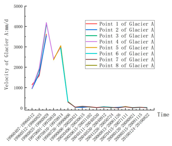 The interval between two adjacent optical remote sensing images in this study is still long. We can only infer the surging active phases over a long period. With the flow velocities, we can shorten the active phases to obtain more accurate results. Using the glacial flow velocities of the five studied glaciers, we extracted the velocity values along the centerline (the black curve in Figure 4a) for further studying and discussion. To display relevant information, we extracted the eight points on the centerline at equal intervals, which have undergone mean calculation with several surrounding points. Figure 7, Figure 8, Figure 9, Figure 10 and Figure 11 show the speed on the vertical axis and time on the horizontal axis. Each line represents the point we chose on the glacier’s centerline.