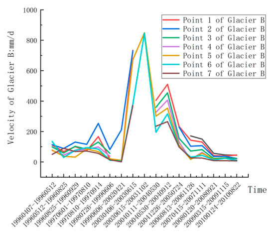 Although Glacier B has similar location information and elevation information to Glacier A, the movement of Glacier B is far less severe than Glacier A. The flow velocity of Glacier B suddenly increased in April 2003, and the velocity exceeded 800 mm/d. The flow velocity in the first half of 2004 was also around 400 mm/d. It is known that the movement gradually returned to normal at the end of 2004, and it remained within 150 mm/d. The maximum speed of Glacier B from 2003 to 2010 (more than 800 mm/d) is five times the normal speed (less than 150 mm/d). It can be speculated that Glacier B had a glacier surge event during this period, and the surging event possibly occurred in 2003.