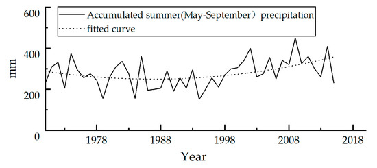 Accumulated summer precipitation of Tuotuohe Station (mm).