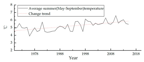 Many researches about surge-type glaciers have hypothesized that climate may be incentives for glacier surging, considering that dramatic changes in climate may lead to catastrophic events [51]. The nearest weather station to this study area is the Tuotuohe Station (Figure 1a). According to the accumulated summer precipitation and average summer temperature of Tuotuohe Station from 1970 to 2015 [52] (Figure 12 and Figure 13), it is easy to see that there were no extreme weather events in the study area between 1970 and 2015, and both precipitation and temperature show a slow upward trend. The five glaciers in this paper have highly similar external and internal conditions, such as similar elevation changes, climatic conditions, and so on. The experiment results show that some glaciers were surging and some glaciers remained stable, and the surging active periods are different. So, the warming of climate is not the dominant factor leading to the surging phenomenon in the five glaciers and might be a small factor with a positive effect.