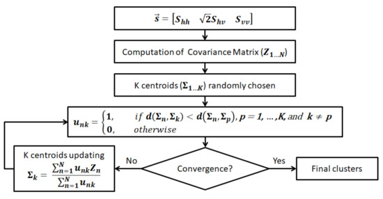 Figure 1 presents the steps of the SC algorithm. The first step consists in converting the PolSAR data into a set of covariance matrices , then the initial centroids are randomly selected. Thereupon, new partitions are generated by assigning each sample to its closest cluster center by applying Equation (13). The algorithm convergence is verified. If this verification fails, the centroids are updated using Equation (14), otherwise, the final clustering is achieved.