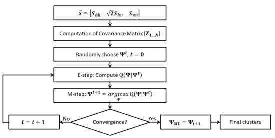 Figure 2 shows the steps applied for the EM algorithm. In the beginning, the PolSAR data sample shall be upload and transformed into covariance matrices. After that, the EM steps are executed: first the E-step followed by the M-step; the convergence is checked and if the algorithm does not converge, then the parameters are updated, otherwise, the final clustering is computed.