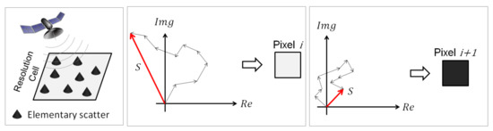 Electromagnetic signals emitted by the radar interacts with elementary scatterers within a resolution cell, as shown in Figure 3a. The elementary scatterers reflect the signal and part of the backscattering is detected by the radar receiver antenna. The received signal S, which will be later transformed into an image pixel value, is the result of a coherent sum of W waves reflected by many elementary scatterers, and it is defined by Equation (21):