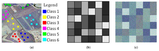 The simulated images, with 3 looks, were obtained from a phantom image (Figure 4b) sizing 240 by 240 pixels. The phantom image contains 36 segments sizing 40 by 40 pixel each. One example of a simulated image is shown in Figure 4c, this image is a color composition of PolSAR in amplitude, where , and .