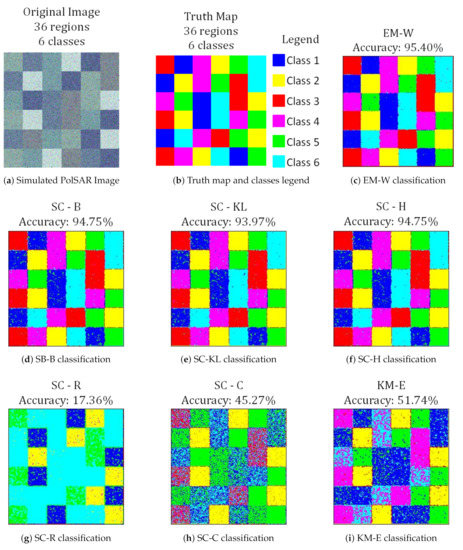The Monte Carlo simulation allows the accuracy analysis of the seven above-cited algorithms: EM-W, SC-B, SC-KL, SC-H, SC-R, SC-C, and KM-E, in order to determine which algorithm gives the best classification. At each Monte Carlo iteration, the algorithms shared the same initial parameters: number of classes, initial centroids, and number of algorithm iteration. All computations were based on a set of one hundred randomly simulated PolSAR images, where each simulated image was tested ten times for different algorithm’s initial parameters. It means that one thousand Monte Carlo iterations were executed for each algorithm. In this experiment the simulated images contain six classes, the initial centroids are randomly chosen and the algorithms stop criteria is the number of iteration equal to five.