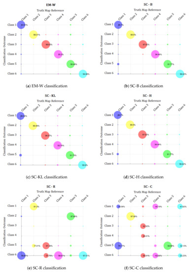 Figure 6 presents one simulated image example (Figure 6a) followed by its truth map (Figure 6b) and the classification result of algorithms: EM-W, SC-B, SC-KL, SC-H, SC-R, SC-C and KM-E, generated by one Monte Carlo simulation iteration. Figure 7 presents the respective confusion matrix of each result showed in Figure 6. The confusion matrix is presented in a bubble chart type of chart, where three dimensions are considered: the truth map in horizontal axis, the classification outcome in vertical axis and the third dimension is the confusion matrix elements value or size, which are represented in perceptual form, therefore the confusion matrix column shall be added up to . The values are displayed at the confusion matrix chart only if they are higher than .