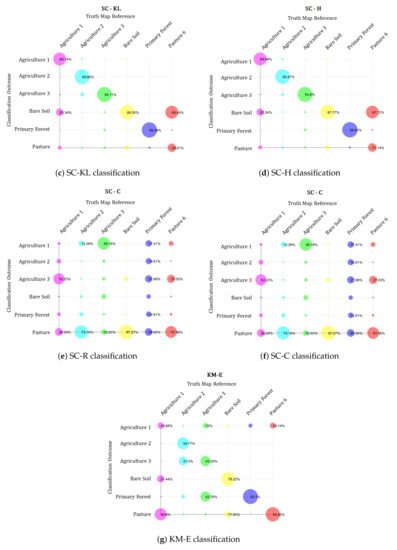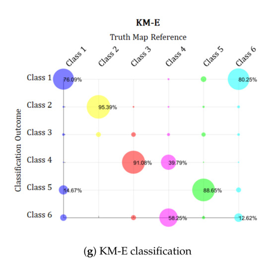 The SC-C also had a bad overall accuracy result () and this could be explained by the nature of this distance. The Chi-square distance is derived from Pearson’s chi-squared statistical test which is used for comparing discrete probability distributions, for instance, histograms. Therefore this distance struggles to discriminate small variances between classes [27], as can be seen in SC-C confusion matrix graph (Figure 7f), this algorithm has the noisier classification result. Finally, the KM-E classification also had a bad overall accuracy result () and was not able to correctly classify the pixels from Class 6, misclassifying those as Class 1. As SC-C, the KM-E also has a noisier classification result.