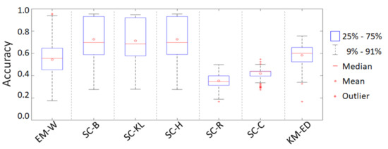 The overall accuracy of EM-W algorithm, provided by the Monte Carlo simulation and showed in Figure 8, presents the highest dispersion, meaning that some classifications are really good and others really bad, while the average accuracy is between and . Factors that influence the clustering performance are the algorithm convergence criteria or the number of iterations, initial centroid, outliers and so on. Since the number of iteration is fixed in five, the EM-W algorithm may not converge during this limited number of iteration leading to low accuracy results. The SC-B, SC-KL, SC-H have the most balanced results, were the first quartile and third quartile are between and . Those algorithms have the same number of iteration as the EM-W, therefore SC-B, SC-KL, SC-H may converge to the local optimum quicker than EM-W. As excepted the SC-R and SC-C presents the lower and less dispersed accuracy values. The KM-E has a medium result, having the first quartile and third quartile between and