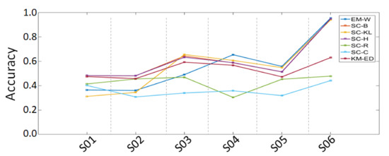 Figure 9 and Table 3 shows the accuracy results for each classification algorithm per scenario, by those results, it can be seen that, even when the initial centroid is not good, the SC-H, SC-B have a better classification accuracy overall algorithms. However when the centroids have a good fit, i.e., when the centroids are taken from scenario S06, the accuracy results achieves high accuracy for EM-W, SC-H, SC-B, and SC-KL algorithm, with 95.29%, 94.77%, 94.67%, and 93.91% of accuracy respectively, while KM-E, SC-R, and SC-C present just a slightly better accuracy results for scenario S06 in comparison with others scenarios.