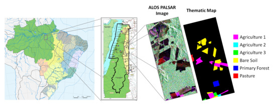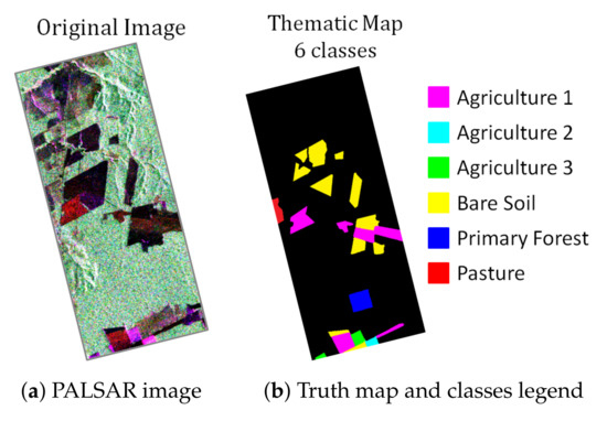 The PolSAR images were obtained by the ALOS PALSAR sensor with approximately 20 m × 20 m spatial resolution, an estimated number of looks equal to 5, and polarization , , and . This image has the classes: Primary Forest, Pasture, Bare Soil, and three types of Agriculture (Agriculture 1, Agriculture 2 and Agriculture 3). Those classes, represented at the Truth map, were identified by a fieldwork campaign conducted by INPE (National Institute for Space Research).